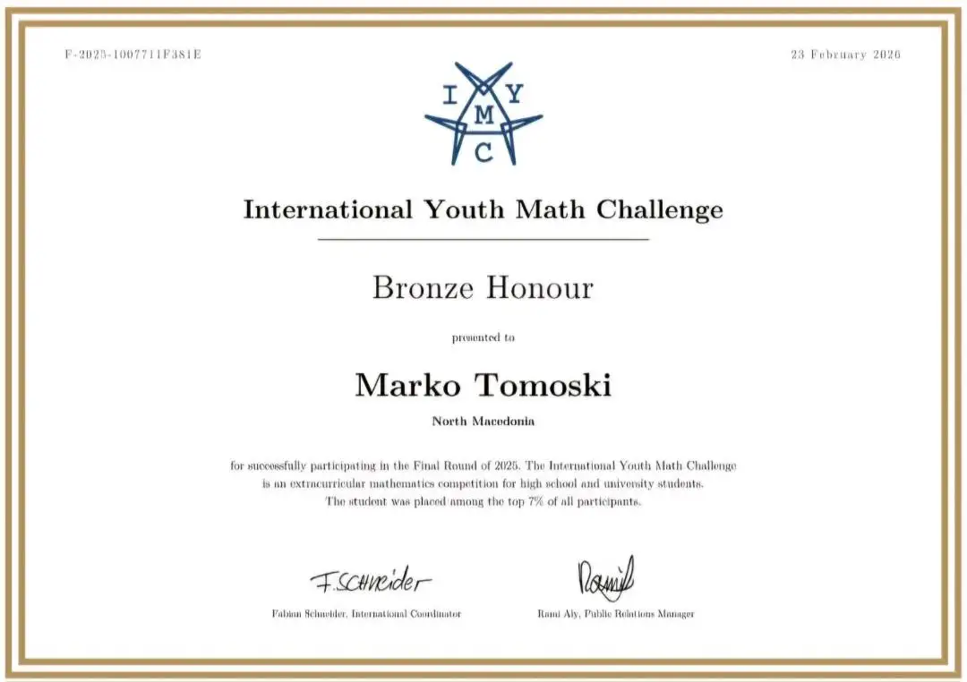 I riu nga Ohri, Marko Tomoski fitoi medaljen e bronztë në garën ndërkombëtare për matematikë për të rinj, International Youth Math Challenge, përcjell TV21. Ai, vetëm 12 vjeç, në kategorinë për matematikantë të rinj deri në 16 vjeç, arriti të fitojë këtë çmim në një garë të fortë me 9.800 pjesëmarrës nga e gjithë bota.