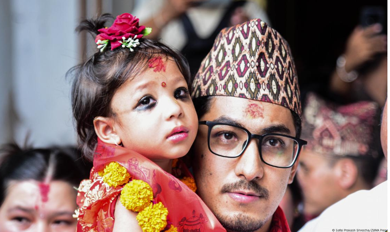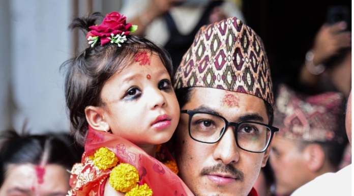 Një dyvjeçare e zgjedhur si perëndesha e Nepalit u bart nga familjarët nga shtëpia e tyre drejt një tempulli gjatë festivalit hindu.