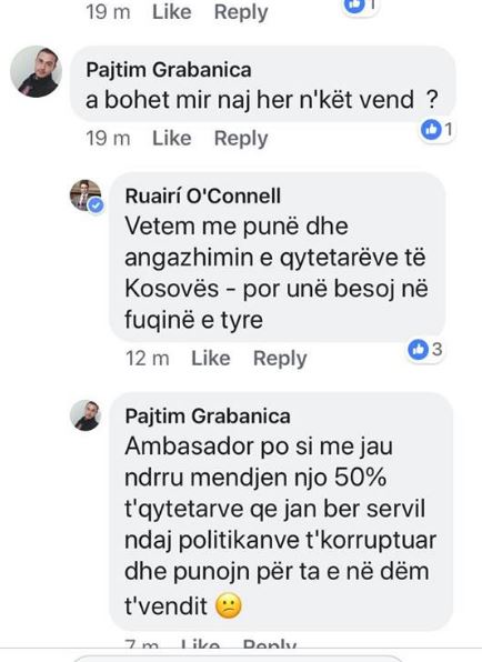 Një ndër komentuesit ka pasur një pyetje të thjeshtë për ambasadorin, duke e pyetur “a bahët mirë najherë n’këtë vend?”.