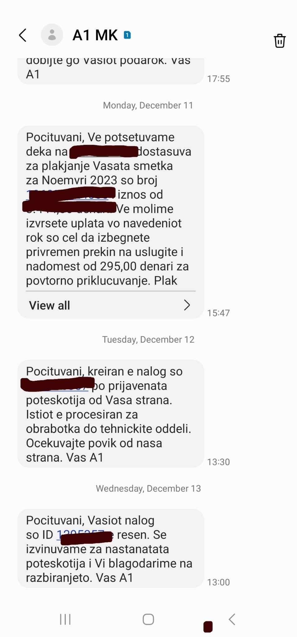 Ai më tej shprehet se për këto ditë që nuk ka pasur shërbim nga A1 i kanë korigjuar llogarinë e pagesës duke i minusuar (20den) nga llogaria e tij. Gazetari i Top24 ka kontaktuar A1 në numrin kujdestar 0771234 ku sapo kyqesh në rrjetë mer njoftimin se kjo kompani ka probleme me ofrimin e shërbimit edhe në Strumicë ndërsa një ditë më parë në një pjesë të Shkupit dhe dy ditë më parë në komunën e Studeniçanit. Top24 ka pyetur se pse qytetarët nuk e marin shërbimin që paguajn, operatori theksoi se po ballafaqohen me probleme teknike në rajonin e Tetovës dhe se nuk mund të ofrohet shërbiimi adekuat deri sa të zgjidhet problemi duke mos specifikuar kur.