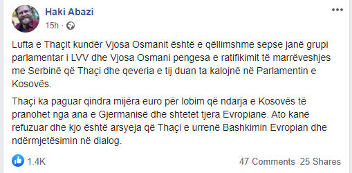 “Lufta e Thaçit kundër Vjosa Osmanit është e qëllimshme sepse janë grupi parlamentar i LVV dhe Vjosa Osmani pengesa e ratifikimit të marrëveshjes me Serbinë që Thaçi dhe qeveria e tij duan ta kalojnë në Parlamentin e Kosovës”, ka shkruar Abazi.