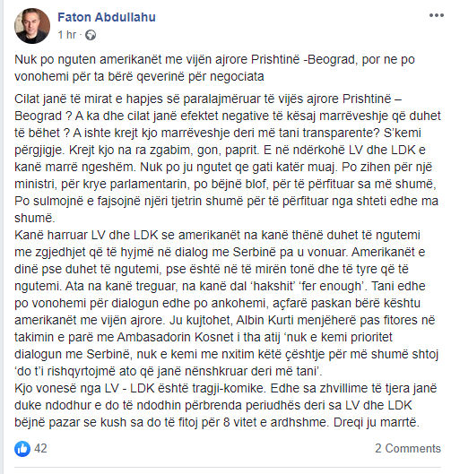 “Cilat janë të mirat e hapjes së paralajmëruar të vijës ajrore Prishtinë – Beograd ? A ka dhe cilat janë efektet negative të kësaj marrëveshje që duhet të bëhet ? A ishte krejt kjo marrëveshje deri më tani transparente? S’kemi përgjigje. Krejt kjo na ra zgabim, gon, paprit. E në ndërkohë LV dhe LDK e kanë marrë ngeshëm. Nuk po ju ngutet qe gati katër muaj. Po zihen për një ministri, për krye parlamentarin, po bëjnë blof, për të përfituar sa më shumë, Po sulmojnë e fajsojnë njëri tjetrin shumë për të përfituar nga shteti edhe ma shumë”, ka shkruar Abdullahu.