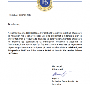 Kabineti i Kryetarit të Bashkimit Demokratik për Integrim ju njohton që Kryetari Ali Ahmeti ka ftuar Kryetarët e partive parlamentare shqiptare në takim të përbashkët për të shqyrtuar zbatimin e Deklaratës së Përbashkët.