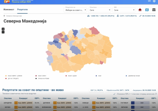 Sipas të dhënave të para jozyrtare nga Komisioni Shtetëror Zgjedhor (KSHZ), partia në pushtet VMOR-DPMNE mori numrin më të madh të këshilltarëve në zgjedhjet e djeshme lokale. Sipas rezultateve të publikuara në ueb faqen e KSHZ-së, janë përpunuar 3.471 nga gjithsej 3.474 vendvotime, që paraqet 99,91 për qind nga numri i përgjithshëm. VMRO-DPMNE mori mbështetje nga 301.919 votuese, ndërsa LSDM-ja opozitare mori 125.824 vota.