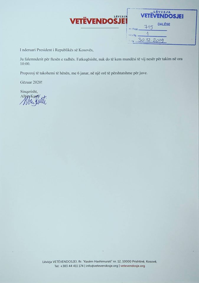 Lideri i Lëvizjes Vetëvendosjes, Albin Kurti, ia ka kthyer përgjigjen Presidentit të Kosovës, Hashim Thaçi pas ftesës së tretë që ky i fundit ia kishte dërguar Kurtit.