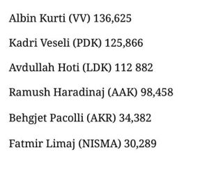 Nga burime jozyrtare, i nominuari i Lëvizjes Vetëvendosje (VV) për kryeministër, ka marrë hiç më pak se 136 mijë e 625 vota, për dallim nga lideri i Partisë Demokratike të Kosovës (PDK), Kadri Veseli, që ka grumbulluar 125 mijë e 866 vota, përcjellur nga i nominuari i koalicionit LDK-AKR-LAA, Avdullah Hoti, që ka marrë 112 882 vota.