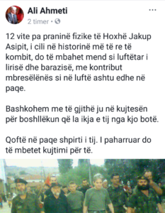 “12 vite pa praninë fizike të Hoxhë Jakup Asipit, i cili në historinë më të re të kombit, do të mbahet mend si luftëtar i lirisë dhe barazisë, me kontribut mbresëlënës si në luftë ashtu edhe në paqe. Bashkohem me të gjithë ju në kujtesën për boshllëkun që la ikja e tij nga kjo botë. Qoftë në paqe shpirti i tij. I paharruar do të mbetet kujtimi për të”, shkruan lideri i BDI-së, Ali Ahmeti.