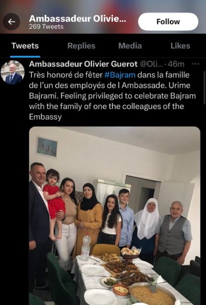 Ambasadori francez, Oliver Guerot e ka pritur Kurban Bajramin në familjen e një punëtori të ambasadës. Ai ka thënë se ka qenë i nderuar që këtë festë e ka pritur në familjen e këtij punëtori.