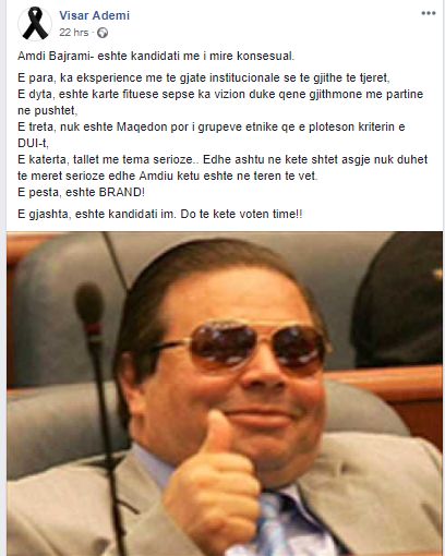 E në këtë kohë partia shqiptare në pushtet BDI është në kërkim të një kandidati konsensual dhe këtë rast e ka shfrytëzuar për të ironizuar analisti Visar Ademi i cili ka propozuar deputetin Amdi Bajram për president konsesual. Analisti në fjalë ka radhitur edhe 6 arsye se pse Amdi Bajram është kandidati më i mirë për president konsensual.