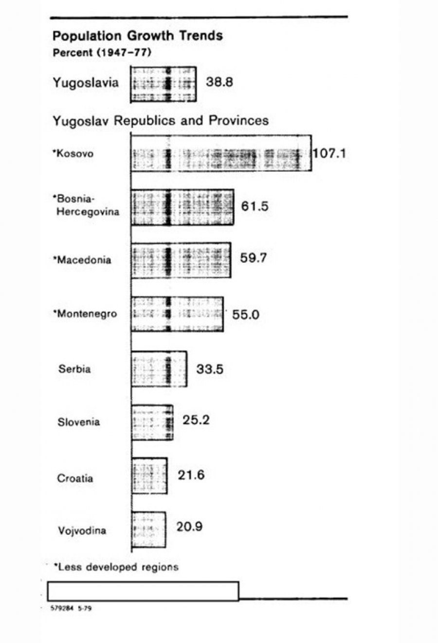 CIA potencon se një milion shqiptarë në Jugosllavi përbëjnë grupimin më të varfër etnik në vend, ndërsa në të njëjtën kohë ka shkallën më të lartë të natalitetit dhe të analfabetizmit, gjë e cila shqiptarët i bën veçmas të lidhur me tokën.
