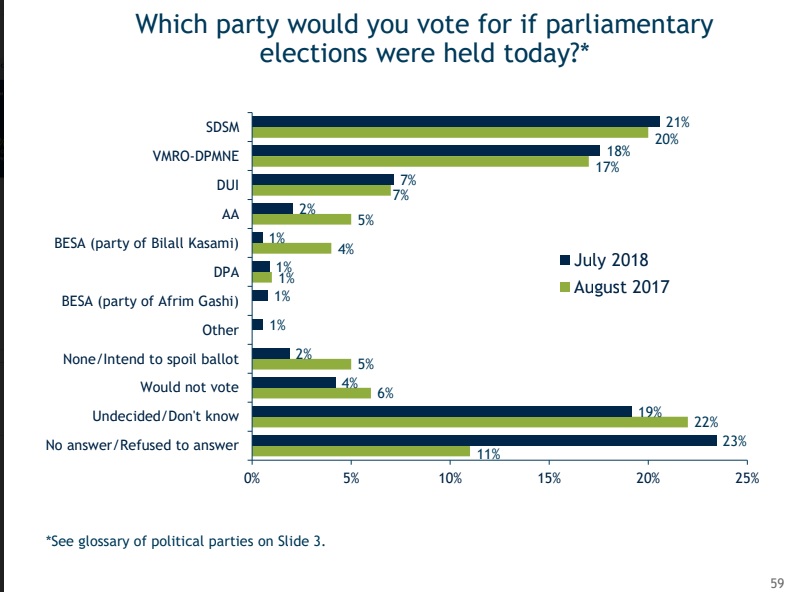 Në anketën e fundit partitë politike shqiptare si Aleanca dhe BESA kanë rënje drastike. Aleanca e Ziadin Selës ka rënje nga 5 përqind në 2 përqind që do të thotë më shumë se gjysma e elektoratit i kanë ikur.