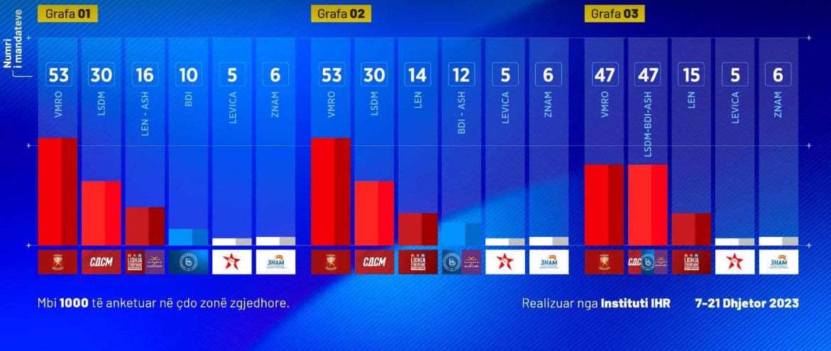 Ndërsa tek kampi politik shqiptar, jepen tre skenarë të mundshëm, pra, nëse Lidhja Evropiane për Ndryshim shkon vet në zgjedhje sipas këtij sondazhi pritet t’i merr 15 deputetë, gjegjësisht 14, ndërsa në nëse koalicionit të opozitës shqiptare i bashkëngjitet edhe Ash-ja ky koalicion pritet t’i merr 16 deputetë. Përderisa BDI nëse shkon vetë në zgjedhje 10, ndërsa në koalicion me ASH 12 deputetë.