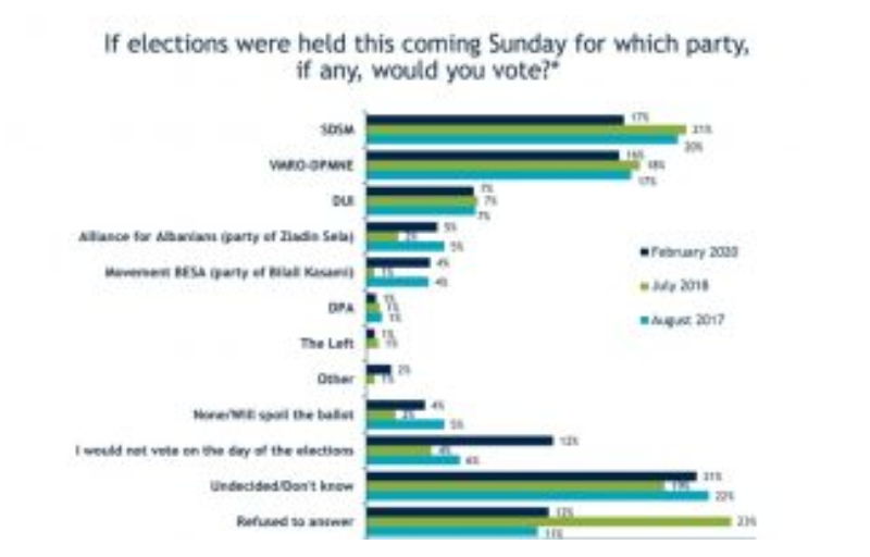 Sa i përket partive maqedonase, për LSDM janë deklaruar 17%, ndërsa për VMRO-DPMNE 16%. Anketa u realizua nga BRIMA Gallup me kërkesë të IRI, gjatë muajit të kaluar me mbi 1200 të anketuar.