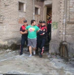 Ai është fotografuar në hyrje të banesës së tij, teksa policia e ka vënë në pranga dhe po e shoqeron.