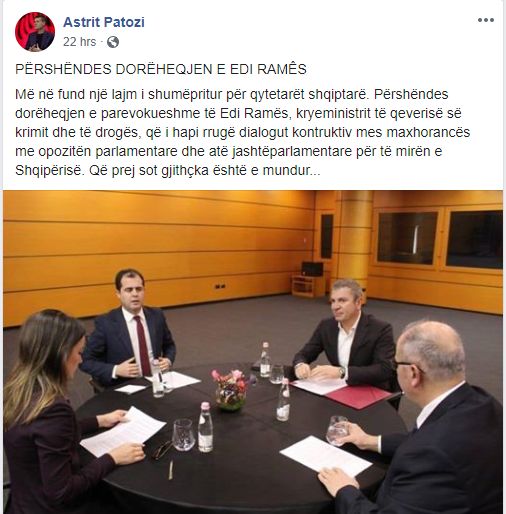 Patozi me nota të forta ironike poston foton e tryezës dhe shkruan se më në fund erdhi një lajm i shumëpritur, ai i dorëheqjes së kryeministrit Rama.