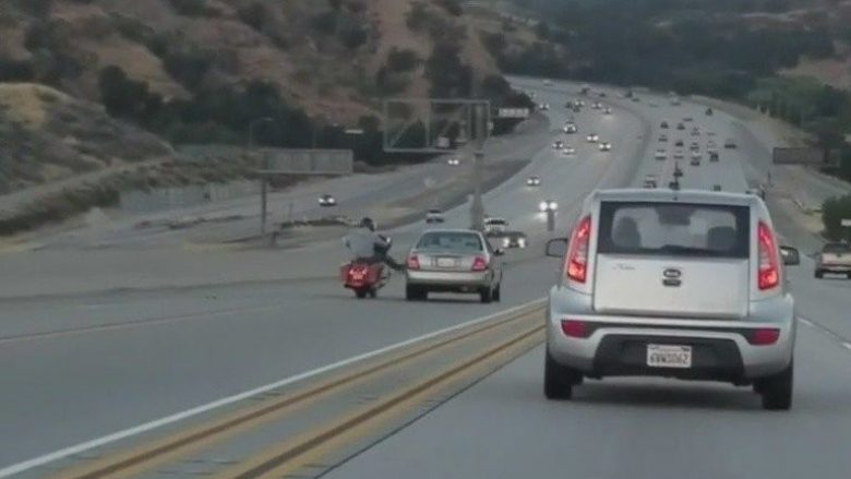 Me vetëm një të goditur me shkelm, motoçiklisti detyron veturën të...