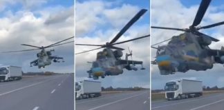 Helikopteri ukrainas fluturon shumë ulët mbi autostradë për të shmangur radarët...