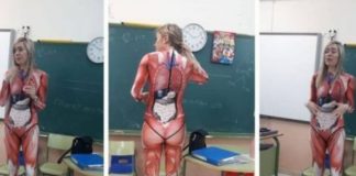 Puna me pasion, mësuesja u mëson fëmijëve anatominë duke veshur një...