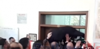 I moshuari hypën sipër njerëzve për të hyrë në gjykatë, pamje...
