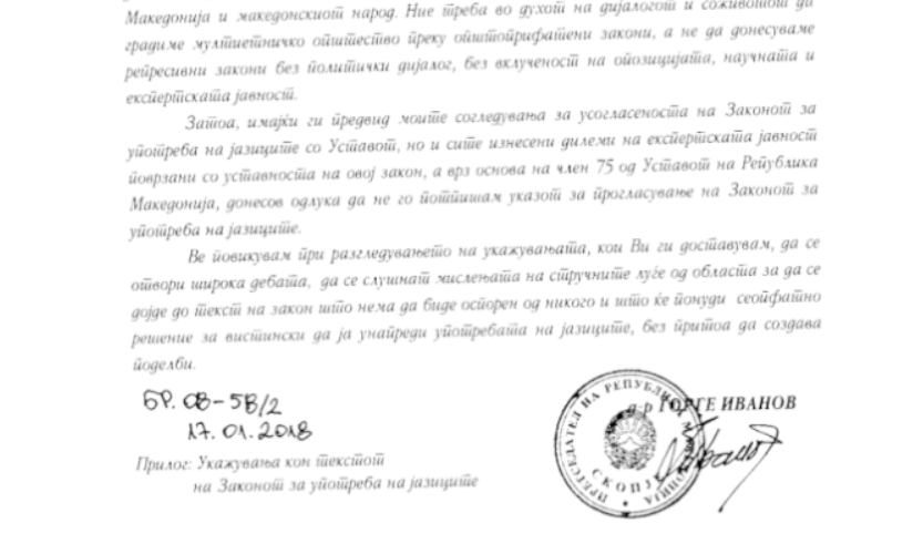 Ivanov dorëzoi 14 faqe deputetëve duke pretenduar se Ligji për Gjuhët...