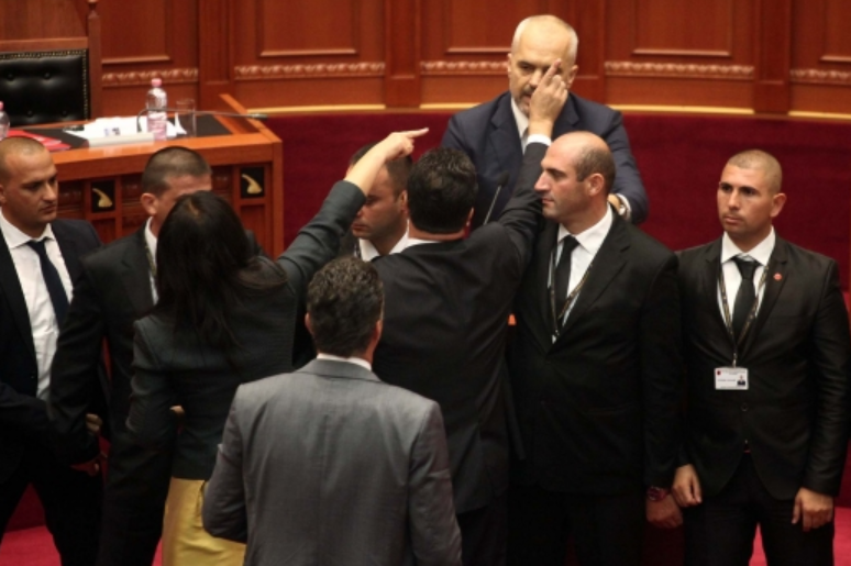 Plas në Kuvend, Rama mbrohet nga gardistët kur afrohet Basha