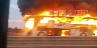 Autobusi i Kosovës përbihet nga flakët në Rrugën e Kombit