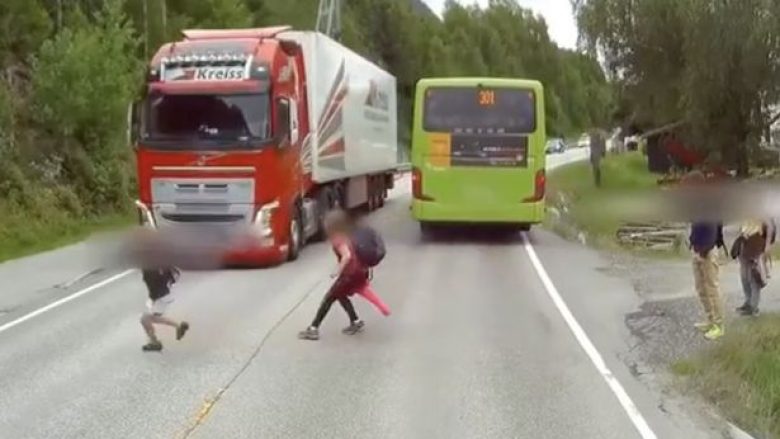 Kamioni frenon me shpejtësi, shpëton fëmija në rrugë (VIDEO)
