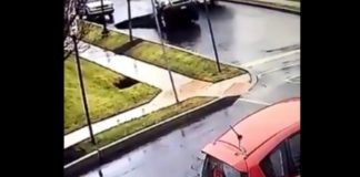 Një gropë e madhe hapet në asfalt derisa vetura ishte në...
