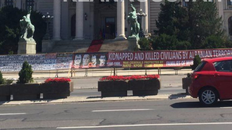 Fotografi dhe pankarta antishqiptare para Parlamentit të Serbisë (FOTO)