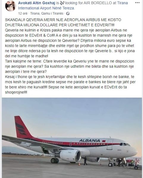 Goxhaj shkruan se qeveria ka marrë një aeroplan airbus për udhëtimet e kryeministrit, Edi Rama, kur vendi ndodhet në kulmin e krizës.