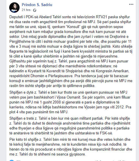 “Së pari paska shpifur me faktin se unë, sipas tij, qenkam ‘Konsull’ gjë që nuk qëndron sepse asnjëherë nuk kam mbajtur grada konsullore dhe nuk kam punuar në atë sektor. Unë mbaj gradë diplomatike dhe jam zyrtari i vetëm në Drejtorinë e Përgjithshme të cilit i është mohuar gradimi për tetë vite, dhe po ashtu për 11 vite e 3 muaj më është mohuar e drejta ligjore të shërbej jashtë. Këto shkelje flagrante të legjislacionit në fuqi i kanë bërë kryesisht ministra të partisë së tij të cilët e kanë sjellur shërbimin e jashtëm në gjendje të mjerueshme. Gjithashtu për sqarimin tuaj z. Tahiri, para angazhimit në MPJ kam punuar për 3 vite shtesë në diplomaci dhe marrëdhënie ndërkombëtare; në kabinetin e Kryetarit të Kuvendit të Shqipërisë dhe në Kongresin Amerikan, respektivisht Dhomën e Përfaqësuesve. Pra tendenca juaj për të barazuar konsujt e emëruar jashtëligjshëm dhe pa asnjë ditë përvojë pune në MPJ me rastin tim është shpifje për arritje të qëllimeve politike”, ka shkruar Tahiri në Facebook.