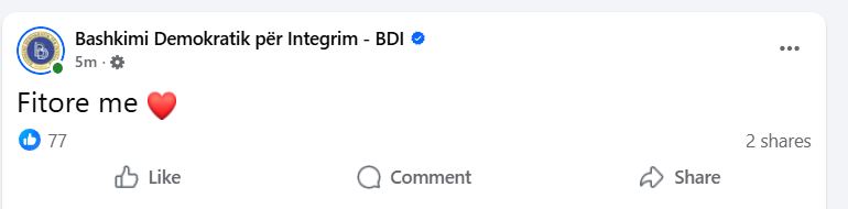 Në faqen zyrtare të Bashkimit Demokratik për Integrim në Facebook, pas zgjedhjeve të sotme të përsëritura në Gostivar dhe Vrapçisht, është publikuar një shkrim i shkurtër: Fitore me zemër (emoji).