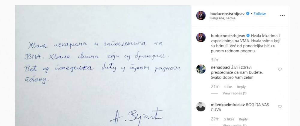 “Faleminderit mjekëve dhe stafit të Spitalit Ushtarak. Faleminderit për të gjithë ata që u kujdesën. Do të jem në punë me orar të plotë duke filluar nga e hëna”, ka thënë Vucic në isntagram, transmeton Express.