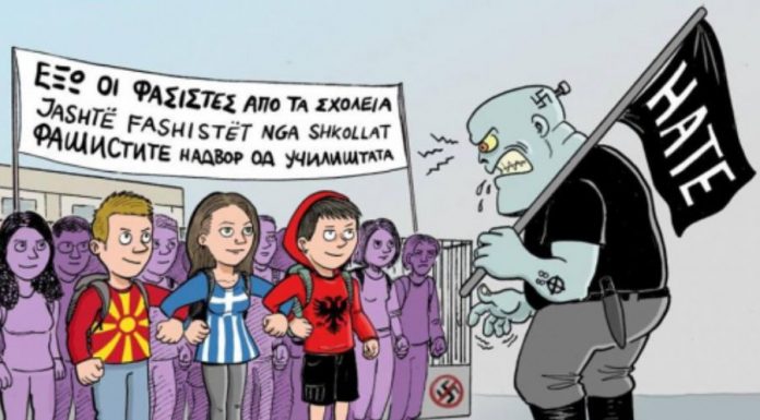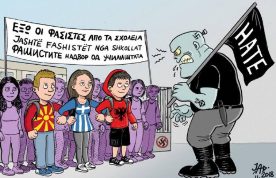 Në lidhje me këtë fenomen, karikaturisti John Antonopoulos ka bërë një karikaturë ku bën thirrje që fashizmi të mbahet larg shkollave.