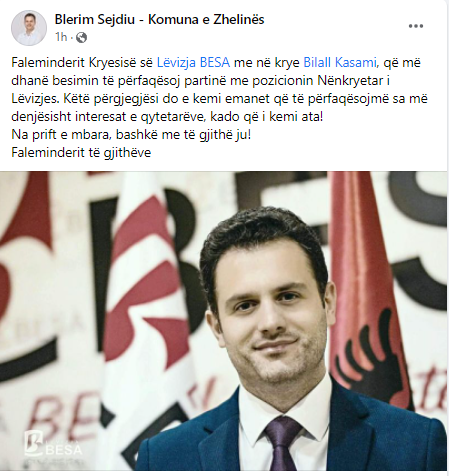Poashtu në rrjetin social ka reaguar edhe tashmë nënkryetari e njëkohësisht kryetari i komunës së Zhelinës, Blerim Sejdiu ku dhe ka falenderuar kryesinë dhe kryetarin e partisë Bilall Kasamin.
