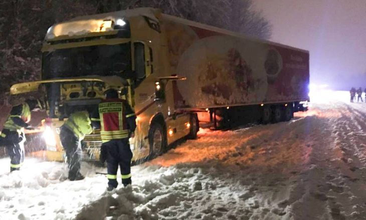 Për pasojë, një kamionë gjatë mbrëmjes së sotme ka rrëshqitur duke bllokuar rrugën.