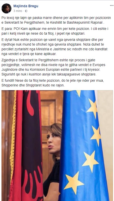 “Po lexoj nje lajm qe paska marre dhene per aplikimin tim per pozicionin e Sekretarit te Pergjithshem, te Keshillit te Bashkepunimit Rajonal. E para: PO! Kam aplikuar me emrin tim per kete pozicion. I cili eshte i pari i ketij niveli qe nese do ta fitoj, i jepet nje shqiptari.