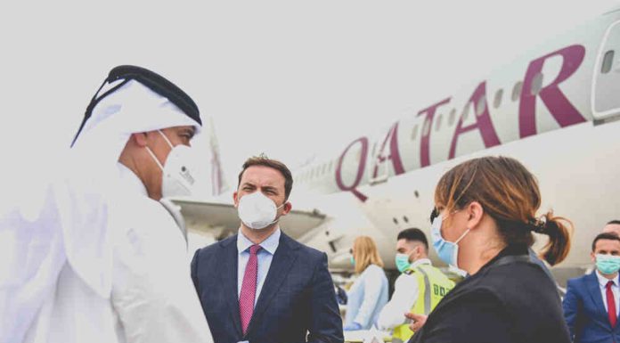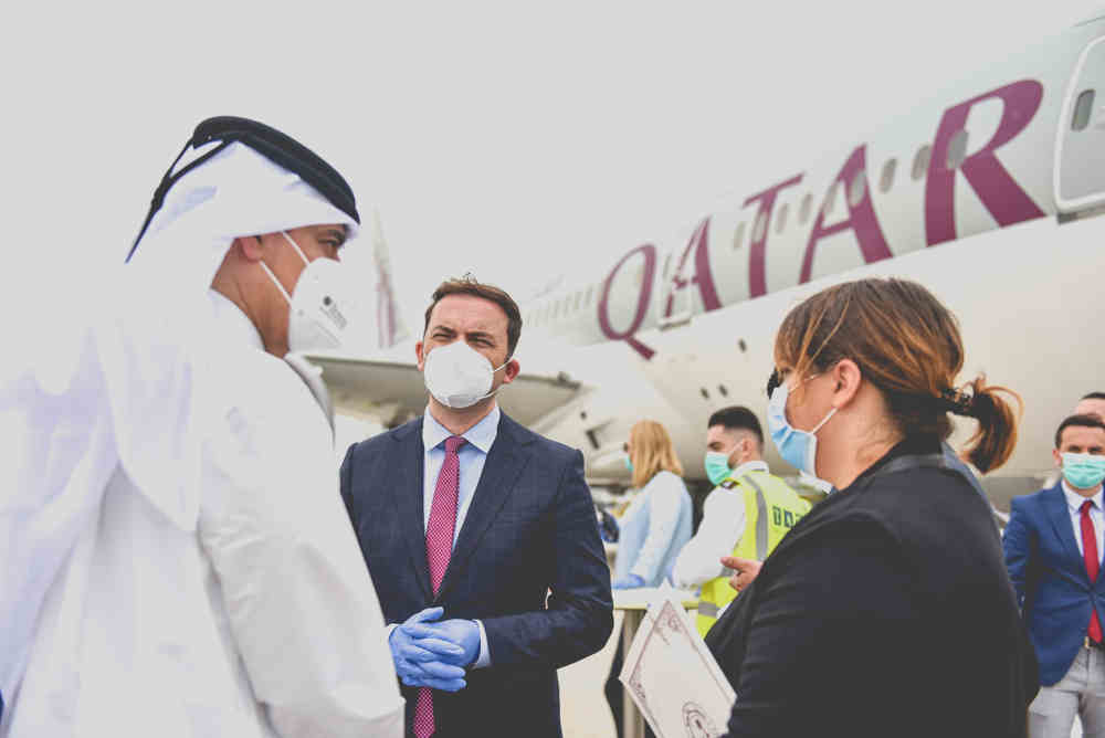 Në aeroportin e Shkupit Zëvendëskryetari i Qeverisë për Çështje Evropiane Bujar Osmani, në rolin e Koordinatorit Nacional për ndihmë të huaj në vend, në prani të Hamad Jasim Al- Mahmud, ushtrues i detyrës Ambasador i Katarit në vend, pritën donacionin – ndihmën për ballafaqim me COVID-19 nga Katari.