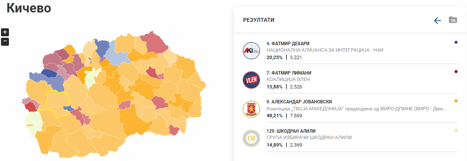 Sipas rezultateve të fundit të publikuara nga KSHZ shihet që prin një kandidat maqedonas ose thënë ndryshe kandidati i VMRO-DPMNE me 7669 vota, i dyti rënditet Fatmir Dehari nga AKI me 3221 vota, Fatmir Limani nga VLEN me 2526 vota dhe kandidati i pavarur Shkodran Alili me 2369 vota.