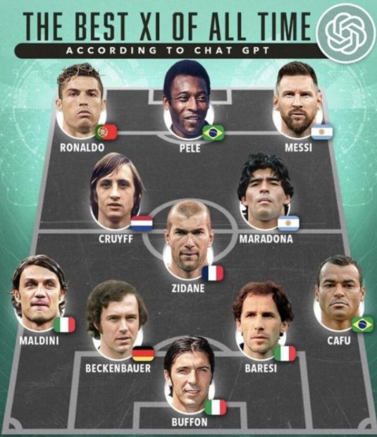 ChatGPT, një aplikacion i inteligjencës artificiale, i cili u publikua nga OpenAI në nëntor 2022, ka shpallur formacionin më të fortë të të gjitha kohërave. Pra, portier është kapiteni aktual i Parmës, 45-vjeçari Gianluigi Buffon.
