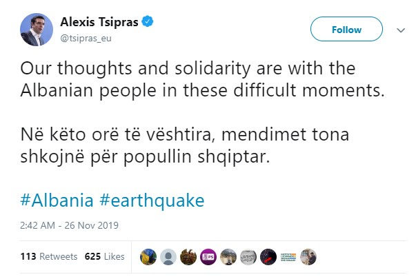 Një mesazh për Shqipërinë, që po përjeton orë të vështira pas tërmetit 6,4 ballë, ka ardhur edhe nga ish-kryeministri grek Aleksis Cipras. Ish-kreu i qeverisë ka postuar një mesazh anglisht dhe shqip në faqen e tij në “Twitter”.