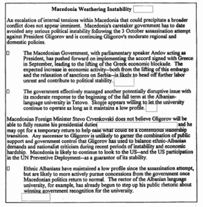 Nuk duket i afërt eskalimi i tensioneve të brendshme në Maqedoni, që do të mund të shkaktonte një konflikt të gjerë jashtë kufijve, shkruante CIA në dokumentet e saj sekrete në vitin 1995 që tani janë publike. Qeveria e përkohshme e Maqedonisë deri më sot ka shmangur ndonjë paqëndrueshmëri serioze politike, pas tentativës për vrasje të presidentit Gligorov (më 3 tetor) dhe po vazhdon me politikat e moderuara të brendshme dhe rajonale të Gligorov-it.