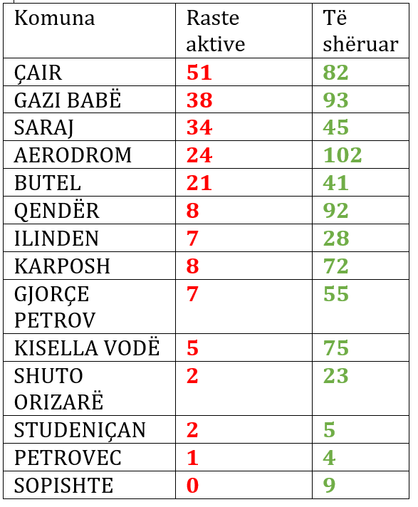 Në komunën e Çairit janë 51 raste aktive nga 82 raste sa janë shëruar deri tani. Gazi Baba radhitet e dyta me 38 raste aktive dhe 91 të shëruar, ndërsa në Saraj edhe pse kishte më pak të infektuar në krahasim më dy komunat e lartpërmendura, 34 raste janë akoma aktive ndërsa deri tani janë shëruar 45 pacientë. Vetëm sot kjo komunë regjistron 6 të shëruar.