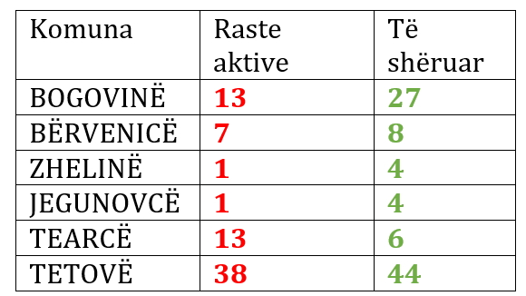 Në Bogovinë ka 13 raste aktive, 27 janë shëruar. Tearca gjithashtu ka 13 raste aktive dhe vetëm 6 të shëruar, ndërsa në Bërvenicë ka 7 raste dhe në Zhelinë dhe Jegunovcë nga 1 rast aktiv.Sa i përket Tetovës dhe rajonit si vatër me më shumë raste me Covid-19 për momentin ka 73 raste aktive. Në Tetovë 44 pacientë janë shëruar ndërsa 38 janë akoma aktiv.