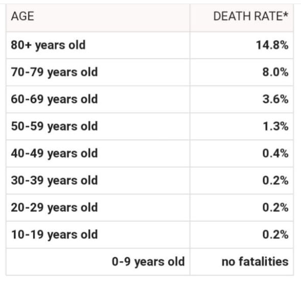 Bazuar në të gjitha 72,314 raste të COVID-19 raste të konfirmuara, të dyshuara dhe asimptomatike në Kinë që nga 11 shkurti, një letër nga KCDC kineze e lëshuar në 17 shkurt dhe e botuar në Revistën Kineze të Epidemiologjisë ka gjetur që rreziku rritet me moshën.