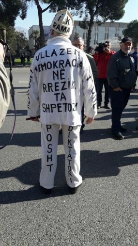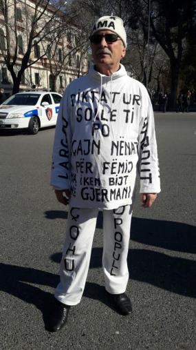 Çohu popull” si dhe “Vllazën demokracia në rrezik, poshtë diktatori”, ishin disa nga parrulat e shkruara në rrobat e protestuesit. /albeu