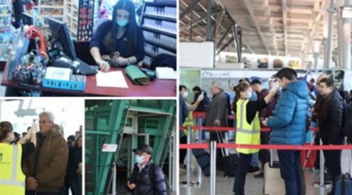 Pasagjeret ne Rinas, sic mund ti shihni edhe ne keto foto te shkrepura nga LSA u nenshtrohen kontrollit qe nga martja e temperatures, nderkohe qe personeli shfaqet me maskat mbrojtese ne fytyre. Me maska mund te shihje sot edhe disa prej pasagjereve.