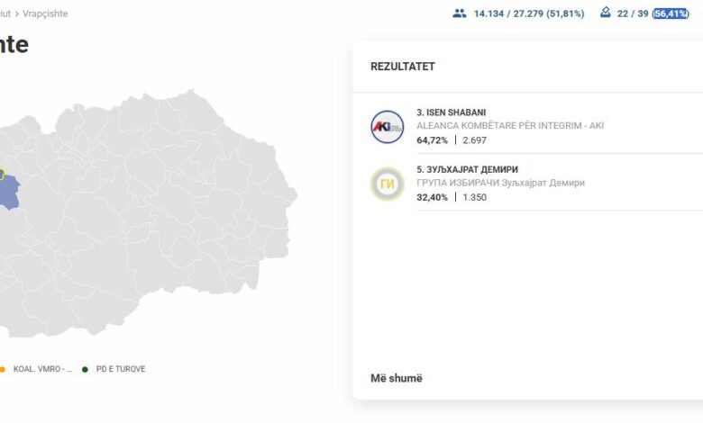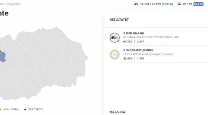 LajmeMaqedoni Dalin rezultatet e para për Vrapçisht, prin Isen Shabani i AKI-së 19:55 / 11.01.2026 Kanë filluar të numërohen votat e para, ndërsa në Vrapçishtë, pas numërimit të 56,41% të votave, po prinë Isen Shabani nga koalicioni AKI.