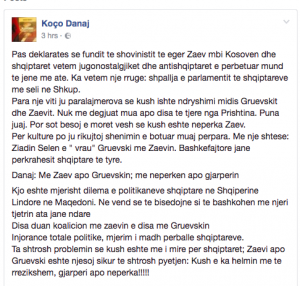 Eksperti për çështje rajonale Koço Danaj ka theksuar se shqiptarët në këtë situatë në Maqedoni kanë një rrugë të vetme: shpallja e Parlamentit të shqiptarëve në Shkup. Ai këtë e ka theksuar pas qëndrimeve të shprehura të liderit social demokrat Zoran Zaev për të drejtat  e shqiptarëve në Maqedoni dhe për çështjen e Kosovës.