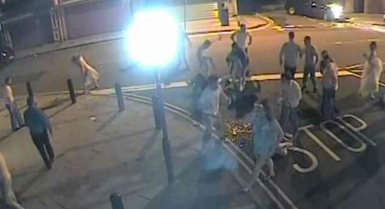 Pamjet e kamerave të sigurisë filmuan momentin kur dasmorët dolën në rrugë dhe u përleshën midis tyre, ndërsa nusja me fustan të bardhë hyri ndërmjet për t’i ndarë.